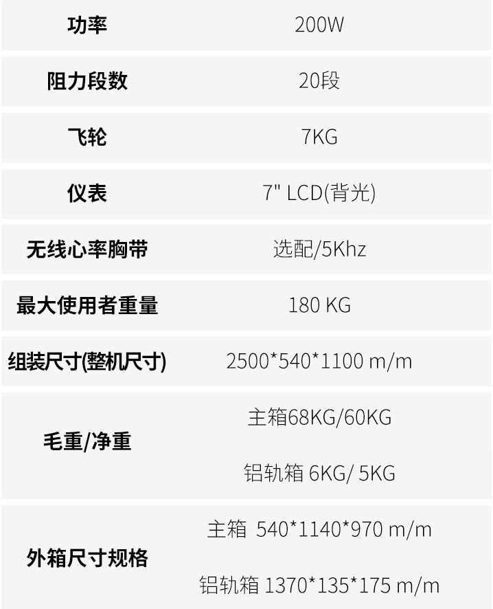 參數(shù)說明 | 1、系統(tǒng):磁控發(fā)電機(jī)+風(fēng)扇飛輪 2、電源:自發(fā)電(LED版) 3、功率:200W 4、阻力段數(shù):20段 5、飛輪:7KG 6、皮帶盤:?235 & ?176 7、皮帶:7PJ838 & 7PJ1092 8、儀表:7" LCD(背光) 9、競(jìng)技:?jiǎn)螜C(jī)競(jìng)技 10、無線心率胸帶:選配/5Khz 11、坐墊:PU發(fā)泡(黑色) 12、最大使用者重量:180 KG 13、尺寸:2500x540x1100 mm |